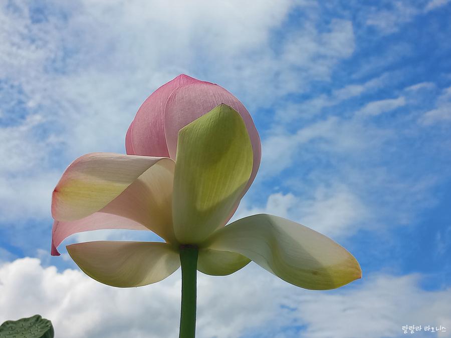 꽃을 예쁘게 보는 방법은 밑에서 위로 보는 것입니다. 파란 하늘에서 내려오는 빛이 꽃잎을 투명하고 밝게 만들어줍니다. 특히나 연꽃은 꽃잎이 넓고 맑아서 올려다보면 연꽃 특유의 청초함이 아름답습니다.