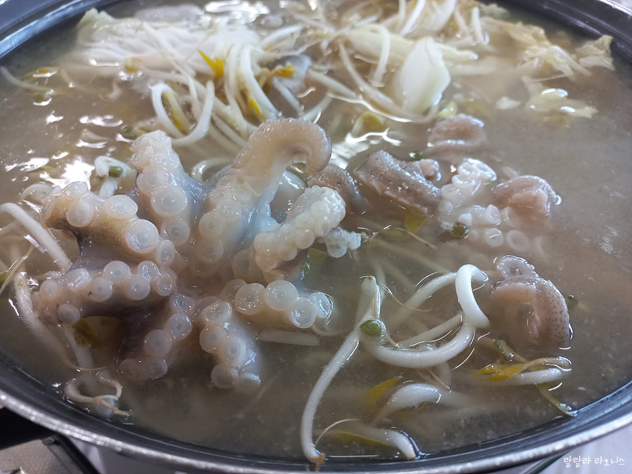 샤부샤부 밑국물(육수)이 나옵니다. 조개는 주꾸미 살 때 주신 것이고요. 배추, 숙주는 기본으로 들어 있습니다. 된장이 살짝 들어간 듯한 색깔의 밑국물입니다. 국물 맛이 진하진 않습니다. 채소 다 먹고 추가할 경우 3,000원 추가 비용 있습니다.
