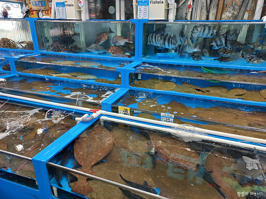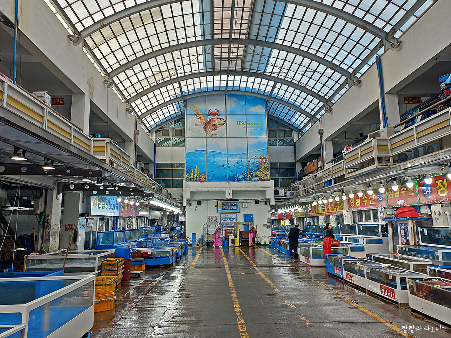 수산시장 안으로 들어왔습니다. 깔끔합니다. 생선 비린내 나지 않고요. 시장 안에 많은 수산물 가게가 있습니다. 다 경쟁하는 가게이고 하니 가격은 별 차이 없습니다. 서비스를 보고 선택합니다. 바가지가 걱정된다면 사전에 시세를 확인해 보고 가는 것도 좋습니다. 인어교주해적단으로 검색하면 항구별로 수산물 시세를 알 수 있습니다.