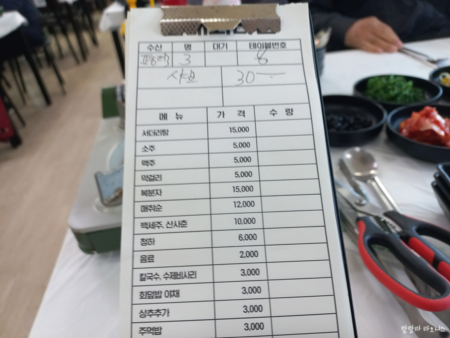 식당에서는 자릿네 내고 먹습니다. 기본 2명이 15,000원입니다. 여기에 1명 추가할 때마다 5,000원씩 올라갑니다. 우리는 3명이니까 기본 15,000원 + 5,000원 해서 20,000원입니다. 여기에 음식을 어떻게 먹느냐에 따라 비용이 추가됩니다. 생선회는 추가 비용이 없습니다. 샤부샤부, 찜, 구이, 볶음, 무침 등으로 먹겠다 하면 1kg당 10,000원의 비용이 나옵니다. 대천항 수산시장 내 식당들 가격 차이는 없을 것이고요.
