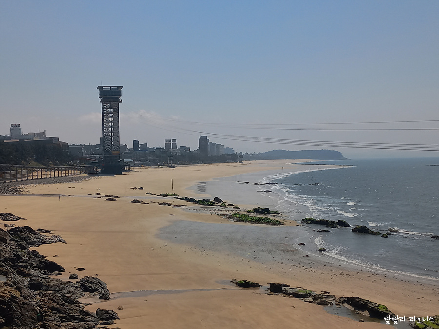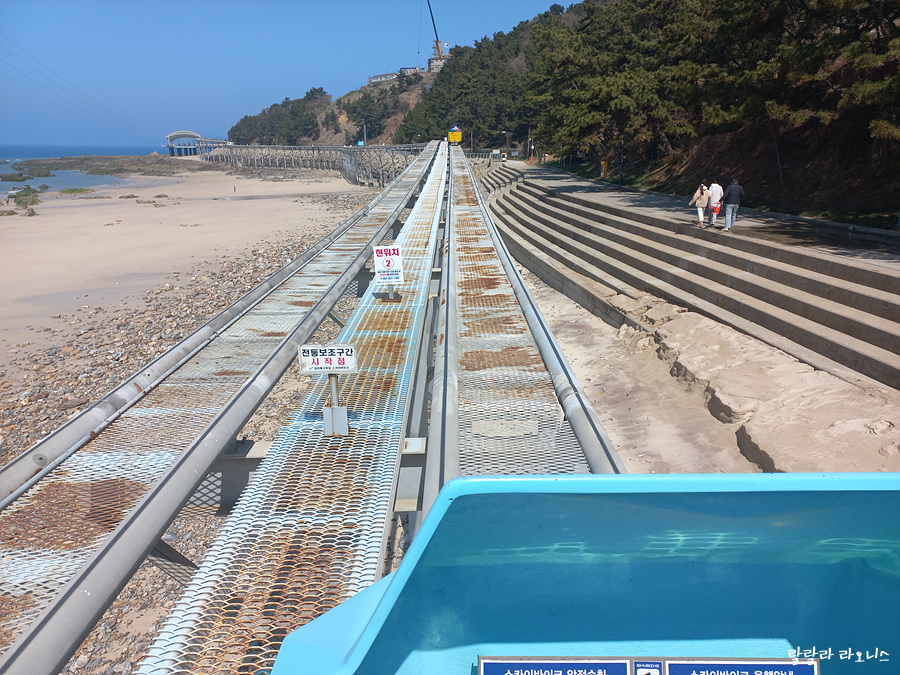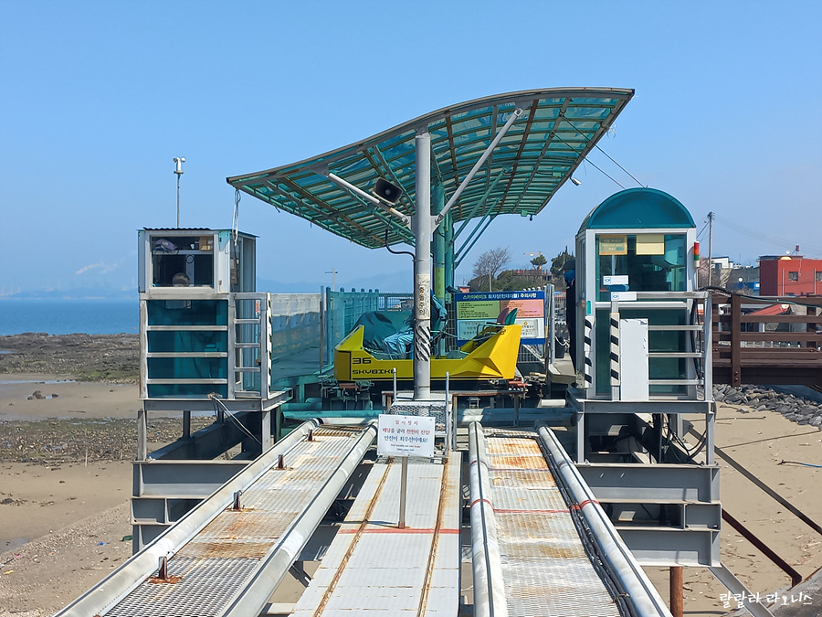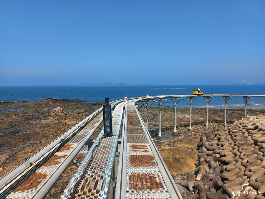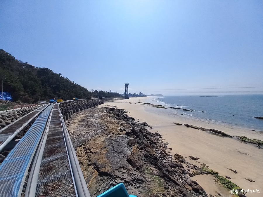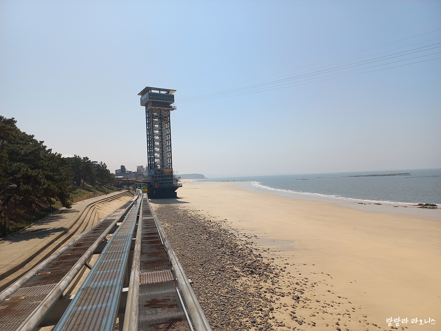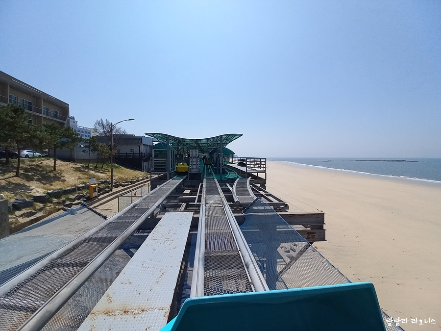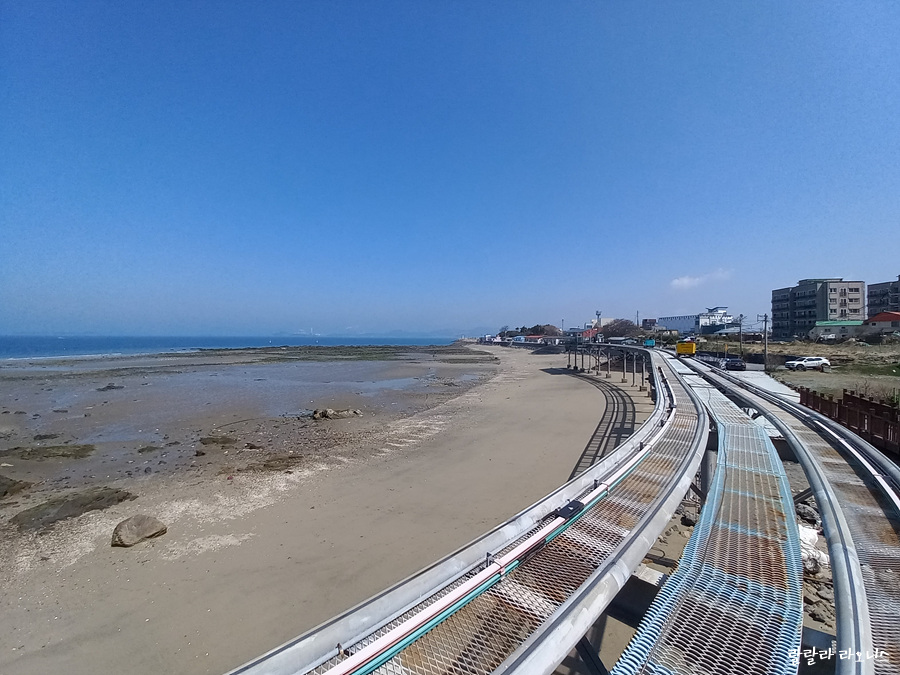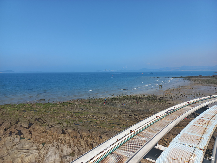 지금은 썰물이라 바닷물이 빠졌습니다. 다른 리뷰를 보니 밀물(만조) 때 타면 스카이바이크 레일 아래에 바닷물이 들어옵니다. 밀물 때 타면 바다 위를 나는 기분이 들겠습니다. 밀물 물 들어왔을 때 타는 게 더 재밌겠습니다. 대천해수욕장 스카이바이크 탈 예정이면 물 때도 확인해 보시고요.