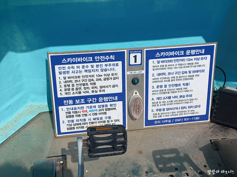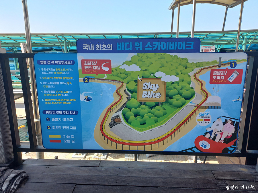 스카이바이크 안전 수칙. 상식적이고 기본적으로 지켜야 할 수칙입니다. 속도를 무한정 낼 수 있는 것이 아니기에 앞 바이크와 안전거리 10m 이상 유지는 충분히 할 수 있습니다. 개인 소지품 낙하 및 분실 주의도 눈여겨봅니다. 자칫 바다로 떨어지면 찾을 길이 없습니다.