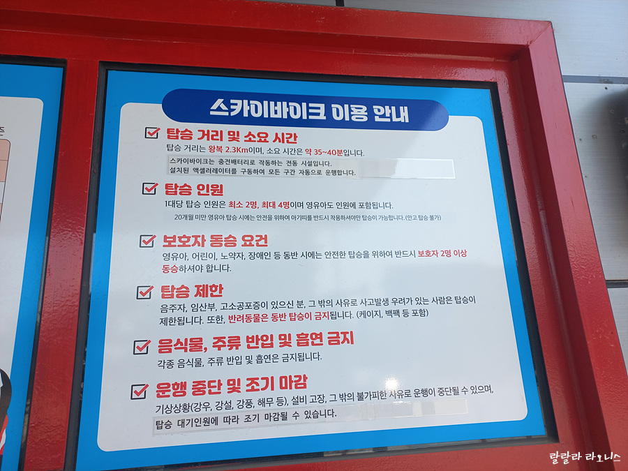 부모님이 재밌어서 하시네요. 앉아만 있어서 재미없어하시면 어쩌지라는 생각도 있었습니다. 높은 곳 좁은 공간에 함께 있으니 여러 가지 대화도 할 수 있는 것도 좋더군요. 탁 트인 풍경을 바라보는 것도 즐겁습니다. 스카이바이크 선택하길 잘했습니다. 비 오거나 강풍 불 때는 탈 수 없다는 것 확인하시고 바람이 강할 때 모자나 소지품 날아가는 것 주의하시길 바랍니다.