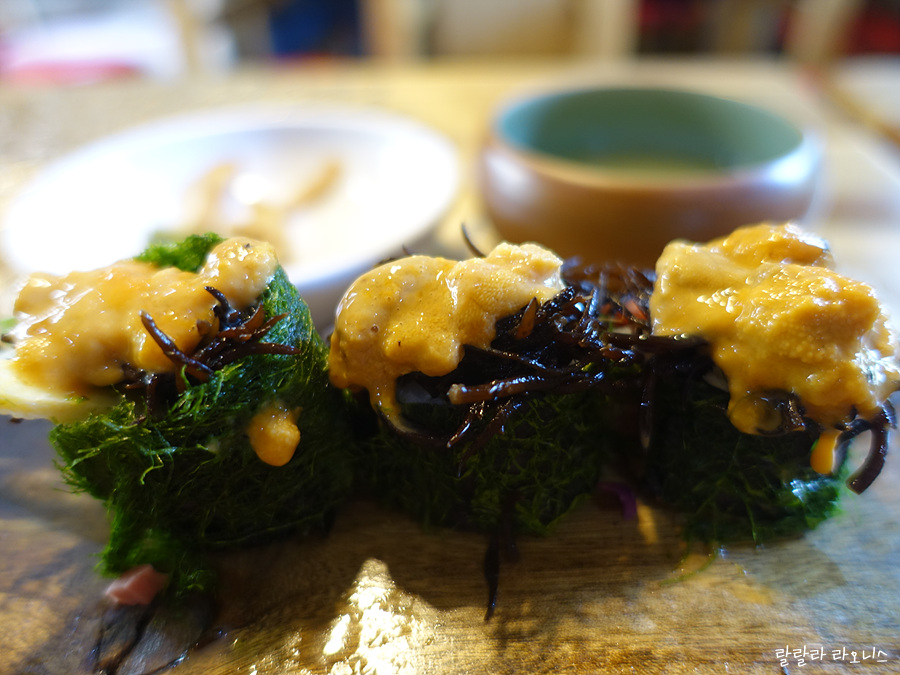 드디어 나온 성게김밥입니다. 8개입니다. 김과 감태로 김밥을 쌉니다. 사장님이 어디선가 톳과 성게알을 꺼내서 위에 올립니다. 다른 리뷰에서 봤을 때보다 성게알이 많이 올려진 것 같습니다. 저만의 생각입니다. 위에 가격표 아래 원산지 표기를 보신 분은 아시겠지만 김밥 속 해산물 재료는 대부분 마라도에서 왔습니다. 제주도의 바다를 가득 먹을 생각을 하니 흥분됩니다.