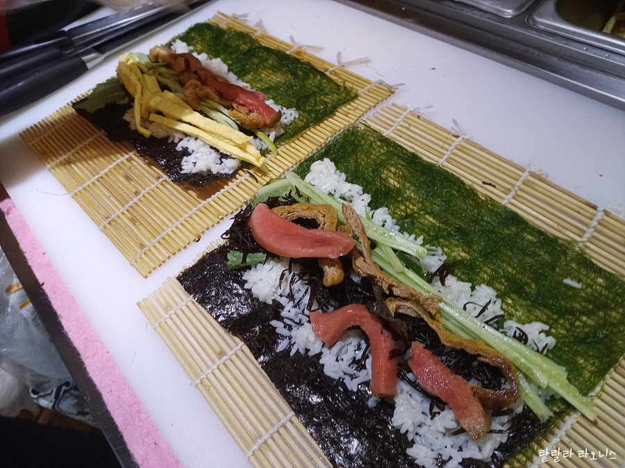 사장님이 김밥을 싸기 시작합니다. 저하고, 아저씨 손님하고 2명 치 싸는 것입니다. 사장님에게 사진 찍어도 되는지 물어보고 찍었습니다. 뭘 이런 걸 찍냐고 하시지만, 싫지만은 않으신 것 같습니다. 바닥에 김과 감태가 깔립니다. 여러 가지 속 재료가 들어갑니다. 오이, 톳도 들어가고요. 성게알이 올라가지 않고 저 상태만으로도 맛있겠습니다.