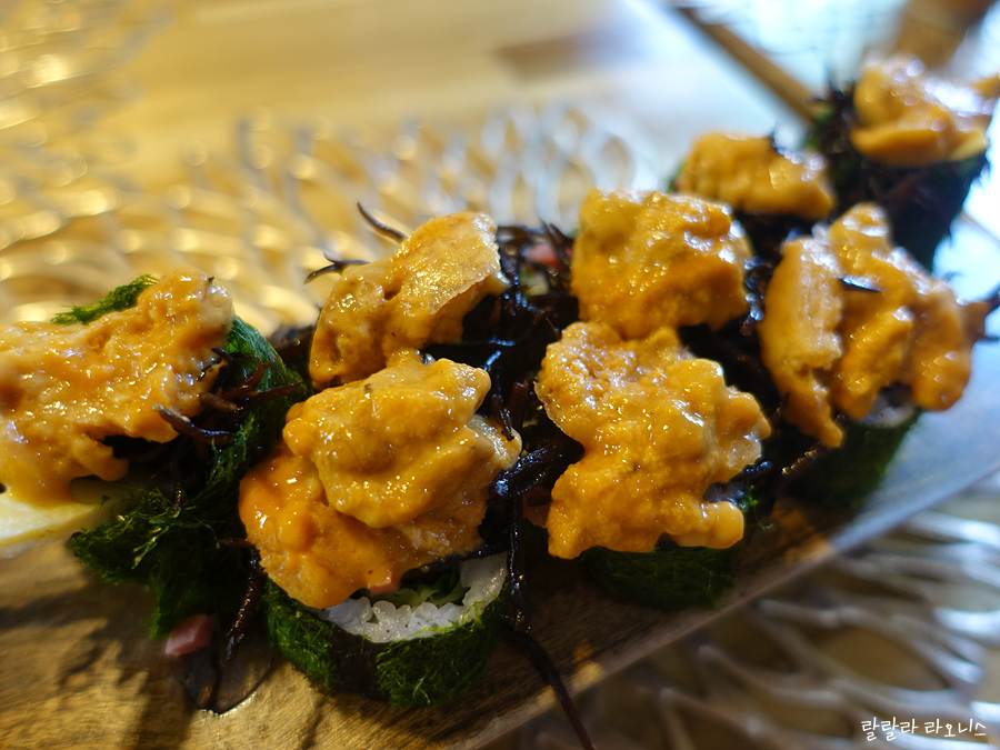 각설하고 하나씩 먹어보도록 하겠습니다. 성게알이 굉장히 부드럽습니다. 거짓말 조금 보태서 입안에서 살살 녹습니다. 성게알을 입안에서 녹여가면서 먹습니다. 아슬아슬한 달콤함이 느껴지는 게 좋습니다. 사이사이 톳의 식감도 톡톡 터지고요. 김밥의 밥알이 느껴집니다. 무엇보다 싱싱한 해산물이 들어간 김밥이라 바다를 한 아름 먹는 기분이 들었습니다. 제 입맛에 딱 맞습니다. 탁월한 선택.