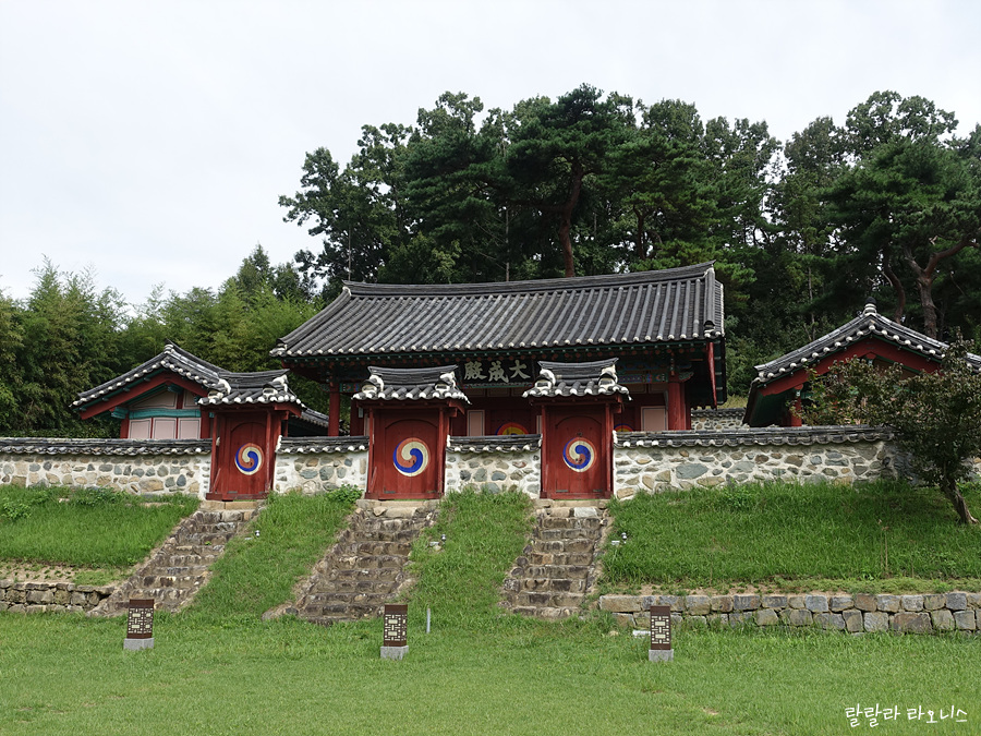 명륜당을 지나 향교 안으로 들어갑니다. 향교 뒤로 대성전이 있습니다. 대성전은 공자를 주향으로 모시고, 우리나라 18현의 위패를 모시고 있습니다. 신성한 공간이기에 향교 가장 안쪽 깊숙한 곳에 있습니다. 대성전 앞으로 내삼문이 있습니다. 보통 다른 향교에서는 문이 하나의 지붕인데, 옥천향교는 문이 따로따로 있습니다. 위엄있습니다.