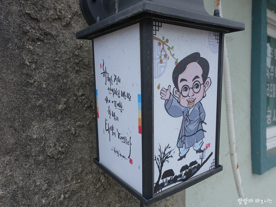 옥천구읍투어의 하이라이트인 정지용 시인을 만나러 갑니다. 시인을 만나러 가는 길 곳곳에서 시인을 만날 수 있습니다. 정지용 시인을 귀엽고 정감있게 표현했습니다. 시 한줄 한줄 읽어가면 어느새 생가에 도착합니다.
