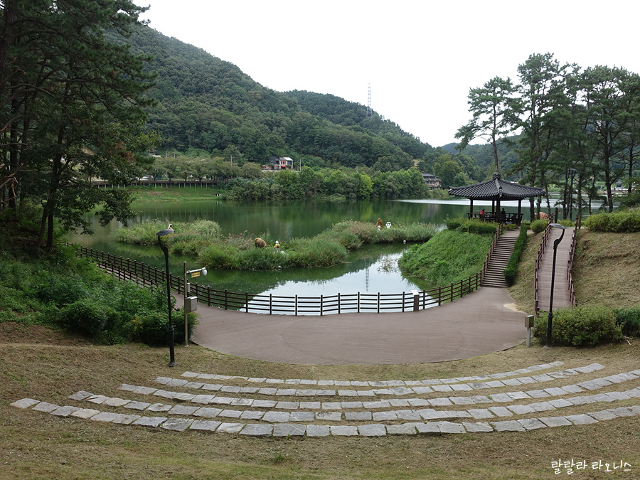 지용문학공원 바로 옆으로 교동저수지(교동생태습지)로 이어집니다. 님을 보고 싶은 마음이 자연스럽게 연결됩니다. 저수지 안에 정지용 시인의 작품을 연상할 수 있는 조형물을 설치하였습니다. 저수지를 따라 산책로를 만들었습니다. 이렇게 예쁜 저수지를 보고만 있을 수 없어서 산책로를 걷습니다. 한바퀴 도는데 대략 30분 정도 걸리더군요.