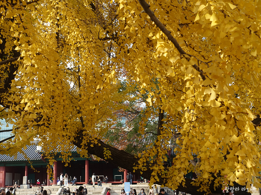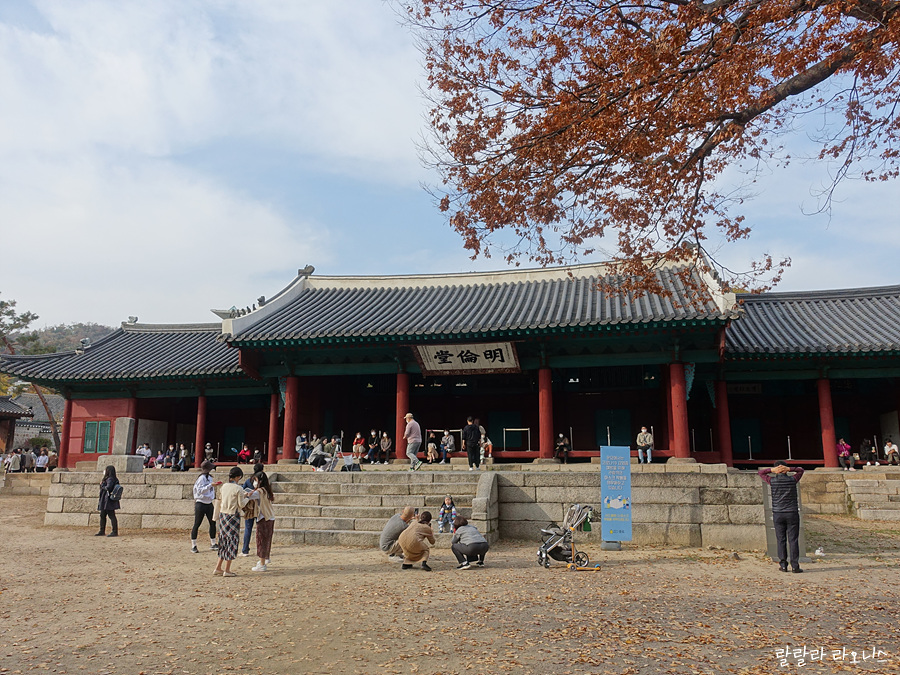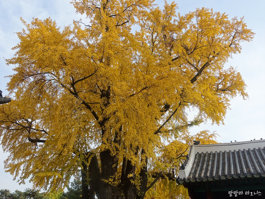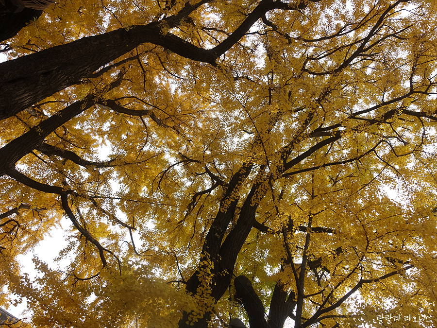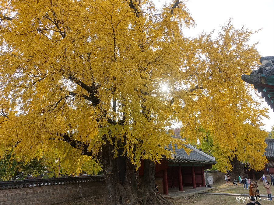 성균관으로 들어왔습니다. 들어오자마자 진짜 깜놀했습니다. 은행나무가 엄청 큽니다. 두 그루입니다. 거대한 은행나무에서 노란 잎이 반짝입니다. 기대했던 것보다 크고 예쁜 모습에 저도 모르게 우와~ 감탄사가 나옵니다. 나무 사이로 명륜당이 보입니다.