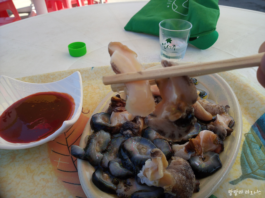 패키지여행이라고 해서 깃발 따라 우르르 다니지 않습니다. 교통, 숙박, 식사까지만 여행사에서 해결해줍니다. 홍도 내에서는 제 맘대로 돌아다니면 됩니다. 같이 배 타고 온 사람들은 벌써 어디론가 사라졌습니다. 전망대 오르기도 하고, 홍도 정상인 깃대봉 등산도 합니다. 저는 일단 뭘 먹고 시작하려고 합니다. 홍도 여객터미널 부근에 해산물 파는 곳이 있다는 것을 미리 알고 갔습니다.