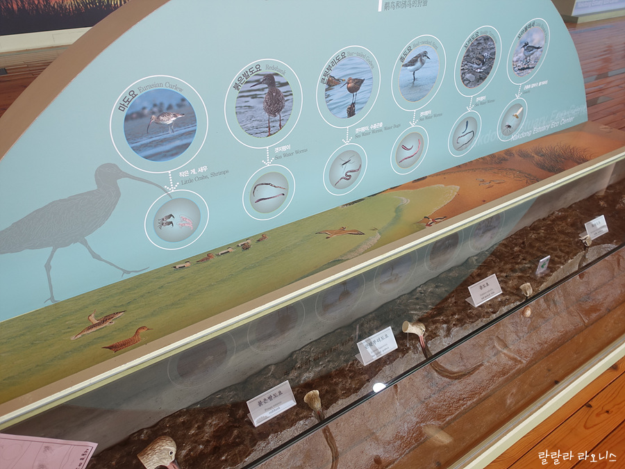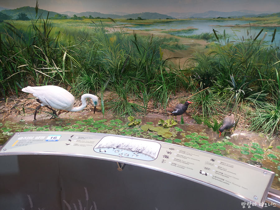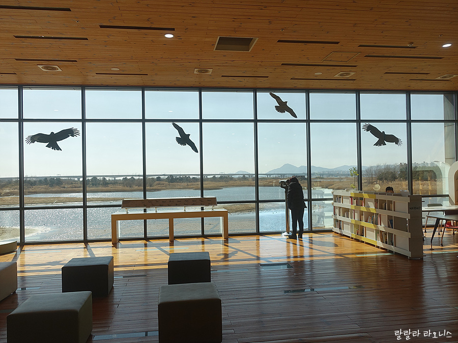 망원경을 통해 멀리 있는 새를 관찰할 수 있습니다. 망원경으로 바라보니 연구원이 된 것 같습니다. 창 너머로 습지가 펼쳐집니다. 커다란 창에는 새들이 그려져 있습니다. 투명방음벽, 건물 유리창 등에 부딪혀서 죽는 새들의 수가 하루에 약 2만 마리라는 기사를 본 적이 있습니다. 스티커를 붙였다고는 하지만 철새가 많이 오는 곳이어서 그런지 사고가 없을까 걱정됩니다.
