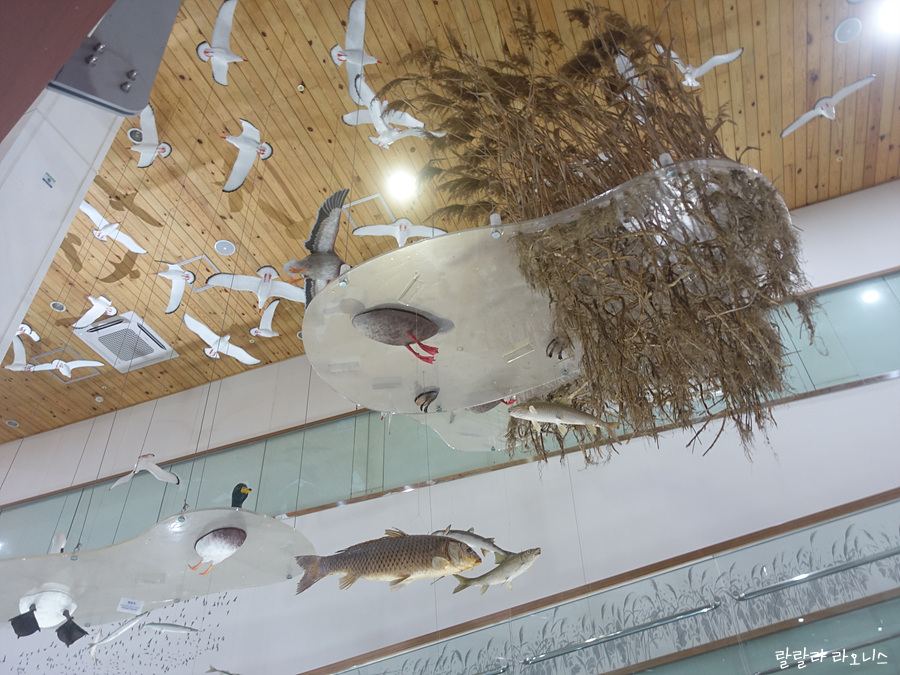 낙동강하구에코센터 들어서면서 놀랐습니다. 동식물이 천장에 매달려 있습니다. 물고기는 아래에 있고 새들은 날아가고 있습니다. 중간에 갈대가 있고요. 낙동강 일대 생태를 압축해서 보여주고 있습니다. 다양한 생명이 살고 있다는 것은 자연이 살아있다는 것입니다. 바닥에 있는 새 발자국을 따라 걸으며 에코센터 이곳저곳을 살펴봅니다.