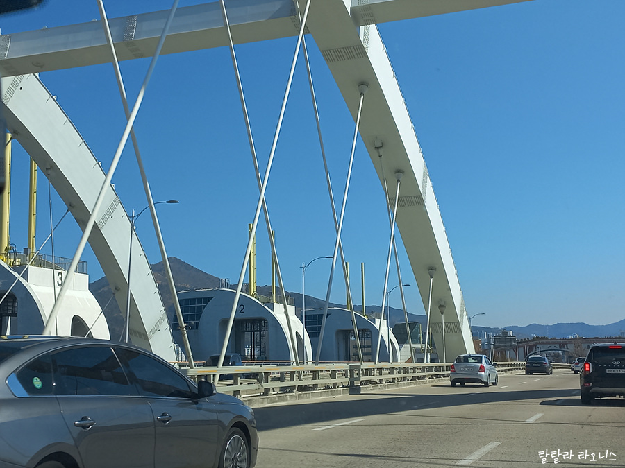 낙동강하구둑으로 접어듭니다. 하구둑은 지리 시간에 배운 기억이 납니다. 강의 하류에 해수의 침입을 막기 위해 만든 것입니다. 염해 피해를 줄이고 교통로로 이용할 수 있는 장점이 있습니다. 반대로 물의 흐름이 원활하지 않으니 환경파괴, 수질오염의 부작용이 생깁니다. 2022년 2월 낙동강 하구둑으로 단절된 물길을 35년 만에 열어서 뉴스에 나왔습니다. 생태계 복원을 기대합니다.