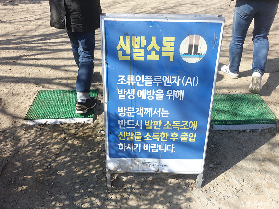 우리가 타고 온 차는 주차장 입구에서 소독약으로 샤워합니다. 공원으로 들어갈 때도 발판 소독을 합니다. 조류인플루엔자(AI) 발생 예방을 위한 것입니다. 도시 사람은 미처 생각하지 못한 것입니다. 조심히 다녀야겠습니다.