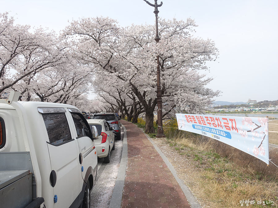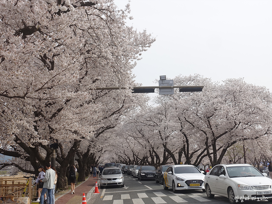 터미널에서부터 차가 엄청나게 막힙니다. 흥무로로 벚꽃 구경거눈 차가 많기 때문입니다. 도로 곳곳에 '흥무로 일원 주정차 금지' 현수막이 있습니다. 현수막과 상관없이 도로에 주차한 차들이 많습니다. 혼잡합니다. 통제하는 사람은 보이지 않습니다.