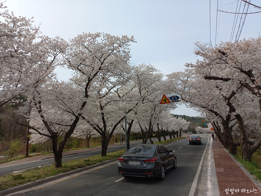 흥무로가 4차선입니다. 길이 2차로씩 나누어져 있습니다. 도로 양 끝과 중앙에 벚꽃을 심은 것이고요. 그러니까 도로 전체가 벚꽃으로 뒤덮인 것으로 보입니다.