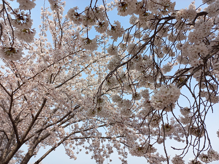 푸른 하늘을 배경으로 벚꽃잎이 팡팡 터지는 모습이 예쁘고 사랑스럽습니다. 몽글몽글한 벚꽃길은 로맨틱합니다. 꽃길만 걷자는 표현은 이럴 때 쓰는 것 같습니다.