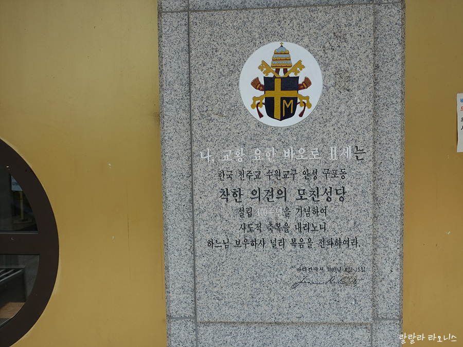 100주년 기념 성당 앞에 교황의 메시지가 있습니다. 교황님의 메세지를 검색해봤습니다. 착한 의견의 모친(성모)은 성모 마리아를 가리키는 여러 호칭 중 하나입니다. 안성성당을 착한 의견의 모친 성당으로 축복했다는 것은 성당을 성모님께 봉헌했다는 뜻입니다. 성당의 주보성인(수호성인)이 착한 의견의 성모님입니다.
