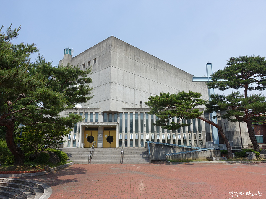 미사가 없는 성당의 낮은 조용합니다. 여유롭고 평화로운 풍경입니다. 그늘 아래서 성당 전체를 조망합니다. 사진 왼쪽에 철제 조형물에 눈길이 갑니다.