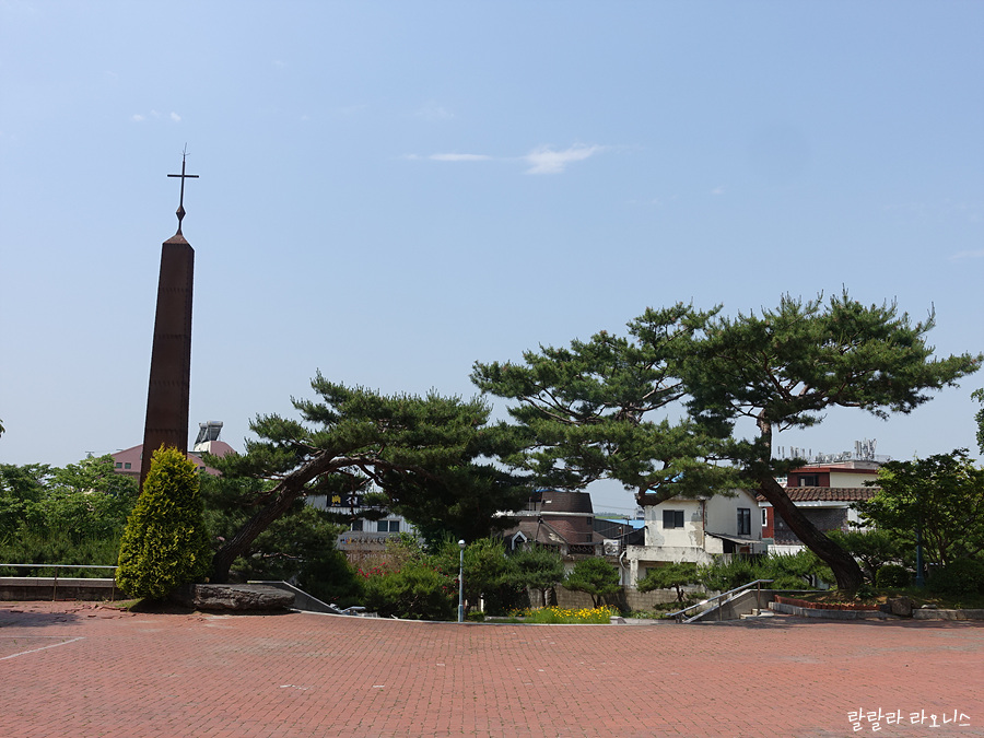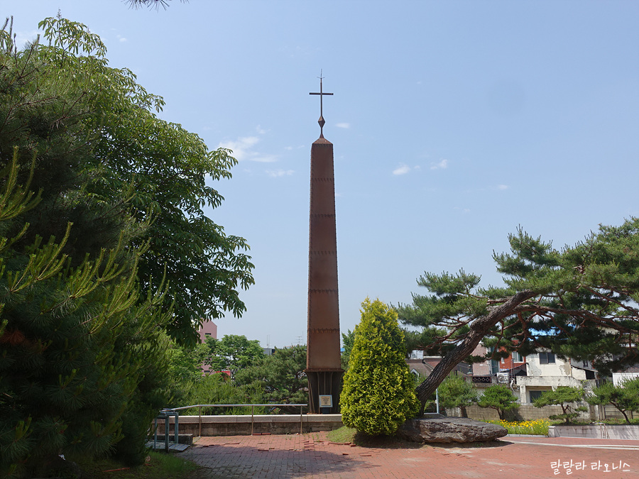 로고스탑입니다. 로고스는 하느님의 말씀을 뜻합니다. 안내문에는 하느님의 말씀이 뿌려진 100년을 기념하기 위해 만든 탑이라 적고 있습니다. 2000년에 타임캡슐을 묻고 탑을 세운 것입니다. 타임캡슐의 개봉은 성당 설립 200주년인 2100년에 개봉한다고 적고 있습니다. 2100년에 우리 없겠죠?