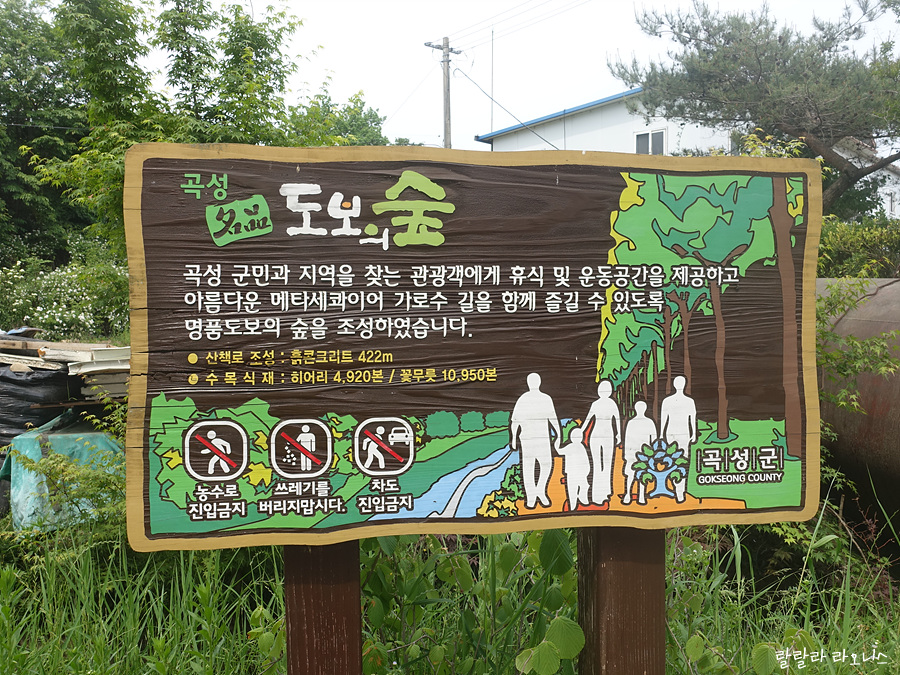 곡성 군민과 관광객에게 휴식 및 운동 공간을 제공하고 메타세콰이어 가로수길을 함께 즐길 수 있도록 명품도보의 숲을 조성하였다 적고 있습니다. 흙콘크리트로 산책로를 만들고 꽃과 나무를 심었고요. 제가 갔을 때는 명품이라는 이름을 붙일 정도로 꽃과 나무가 보이지는 않았습니다.