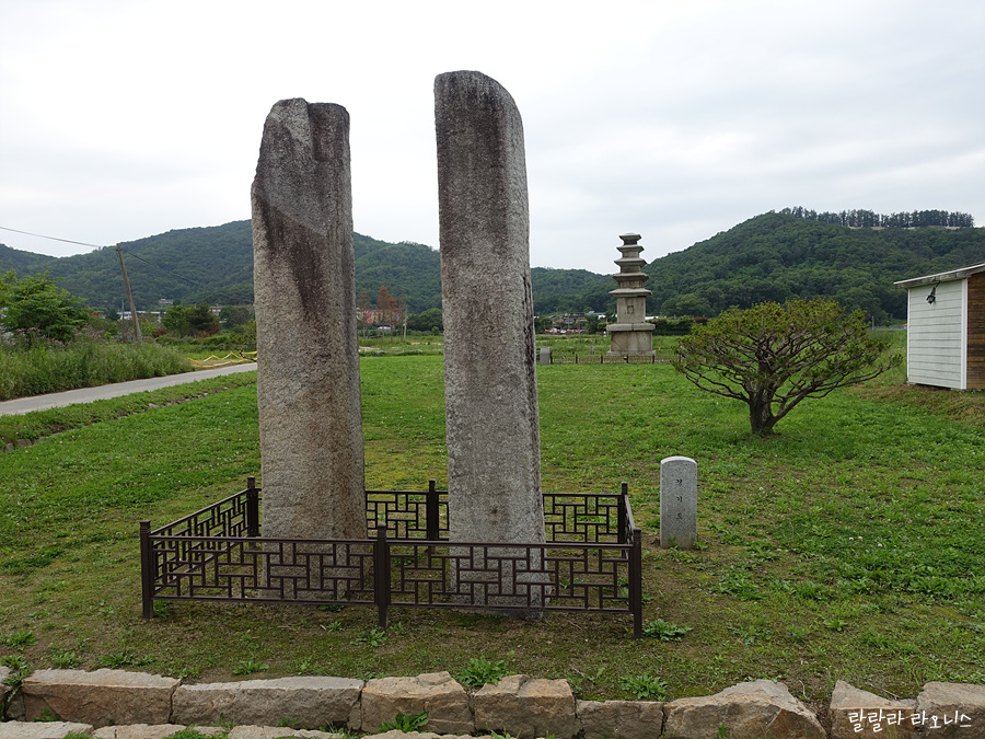 죽주산성에서 내려와 처음 방문한 곳은 봉업사지입니다. 절의 전각은 사라지고 돌로 만든 당간지주와 석탑만이 절이 있다는 것을 알려주고 있습니다. 앞에 두 개의 돌기둥은 당간지주라 합니다. 당은 부처와 보살의 공덕과 위신을 나타내는 깃발이고, 간은 당을 거는 장대입니다. 당간지주는 당간을 고정해주는 지주대입니다.