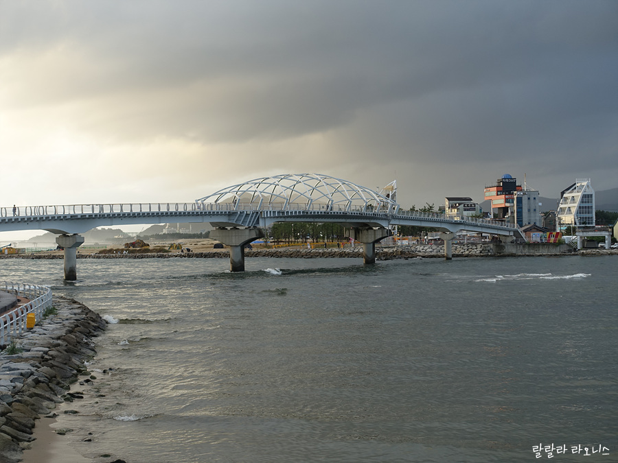 배는 8시에 출항합니다. 7시 30분경에는 여객터미널에서 배표를 받아야 하니 40~50분 정도의 여유시간이 있습니다. 강릉항 일대를 산책합니다. 강릉항 앞에 멋진 다리가 보입니다. 솔바람다리입니다. 사람만 건널 수 있습니다. 다리를 건너가면 남항진입니다. 다리 아래는 동해와 남대천이 만납니다. 남대천 옆으로 이어진 산책로 따라 아침 운동하는 사람이 많습니다.