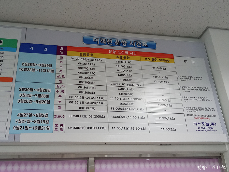 강릉항에서 울릉도 가는 여객선 운항 시간표가 계절별로 다릅니다. 시간이 일부 조정될 수는 있습니다. 강릉에서 떠나신다면 배 시간 잘 확인하시고요. 강릉항에서 울릉도까지 운임은 일반 66,500원. 우등 73,000원입니다.