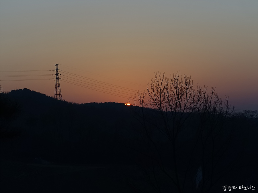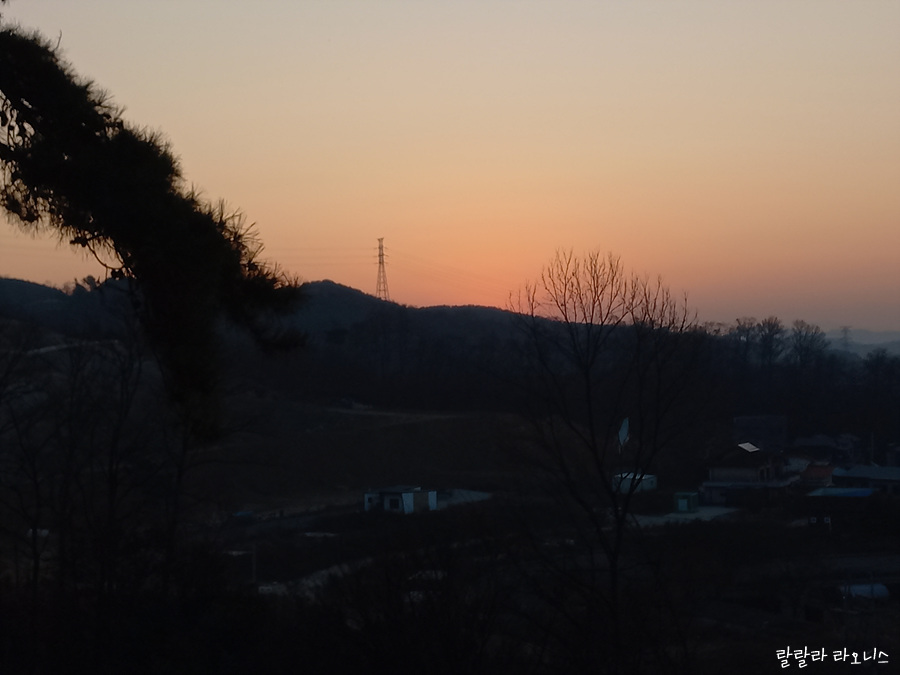 부락산 정상에서 본 것처럼 나무가 시야를 가립니다. 해가 떠오르는 것을 확실히 보긴 어렵겠습니다. 여기서 기다릴까 했지만 뭔가 아쉽습니다. 흔치휴게소 사거리 부근에 탁 트인 곳이 생각났습니다. 사거리 부근으로 되돌아갑니다. 사거리까지 빠른 걸음으로 뛰다시피 걷습니다.