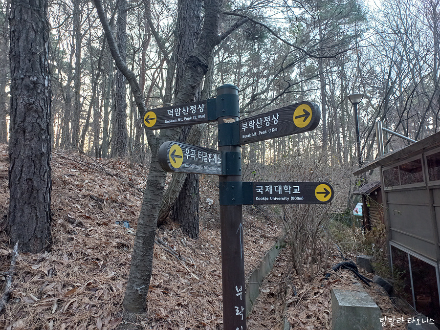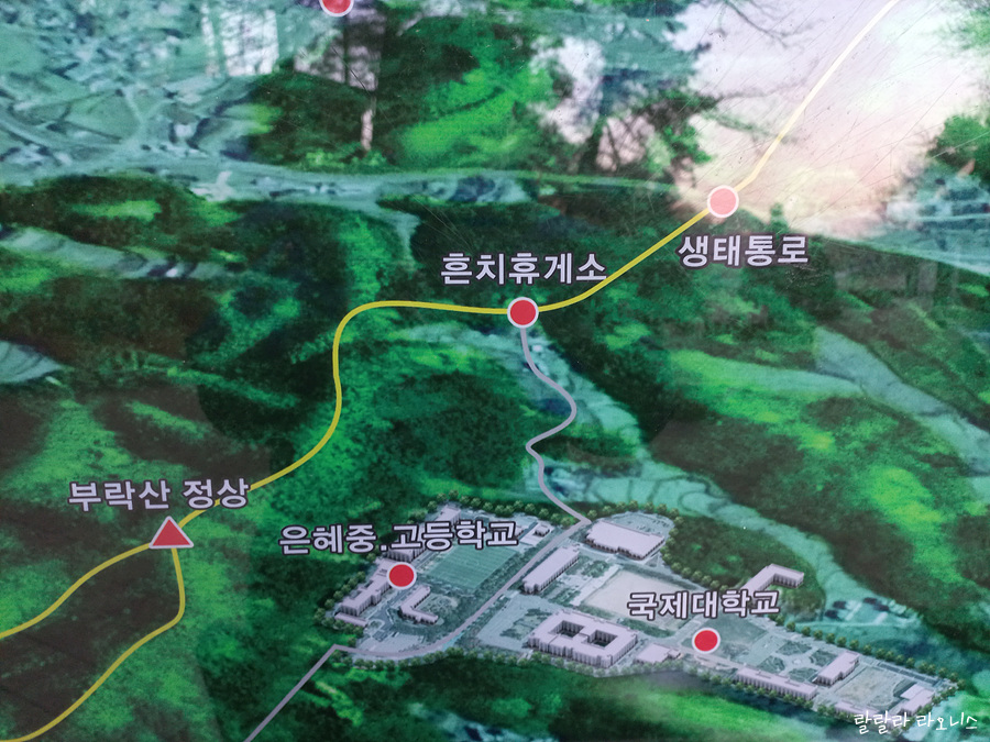 해돋이 보기 위해서는 높은 곳 또는 앞이 탁 트인 곳으로 가야 합니다. 집 근처에서 이 조건을 만족할 만한 곳이 어디일까? 생각하다가 부락산이 떠올랐습니다. 부락산 오르는 길은 많습니다. 그중에서 국제대학교를 들머리로 잡습니다. 국제대학교 정문으로 들어서면 담 따라서 부락산으로 향하는 길이 있습니다.