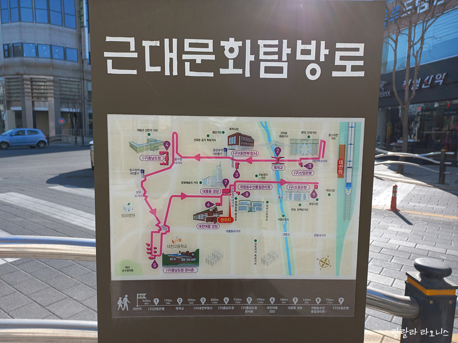 대전역을 기점으로 9개의 건축물이 이어집니다. 옛 산업은행(다비치 안경) - 목척교 - 옛 대전부청사 - 옛 충남도청 - 옛 충청남도 관사촌 - 옛 대전여중 강당 - 대흥동 성당 - 옛 국립농산물품질관리원 - 옛 조흥은행입니다.