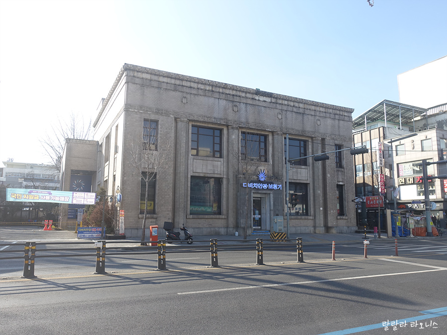 지하도를 지나 바로 지상으로 나왔습니다. 길 건너편으로 안경점이 보입니다. 안경점 간판을 떼고 건물만 보면 옛날 느낌이 묻어납니다. 일제강점기 조선식산은행 대전지점으로 사용하던 건물입니다. 1937년에 만든 것으로 나와 있습니다. 1997년까지 한국산업은행 대전지점으로 사용하였습니다. 만주와 독일에서 수입한 대리석과 테라코타를 이용해서 지었습니다.