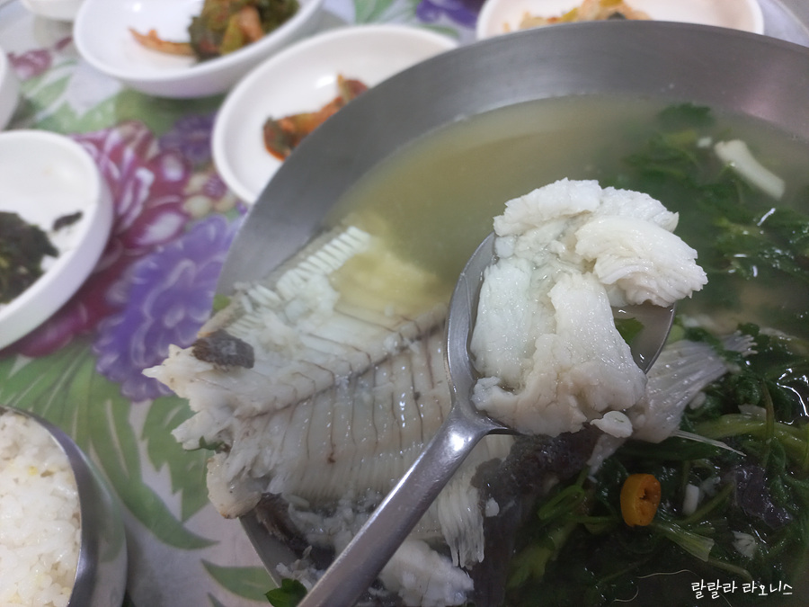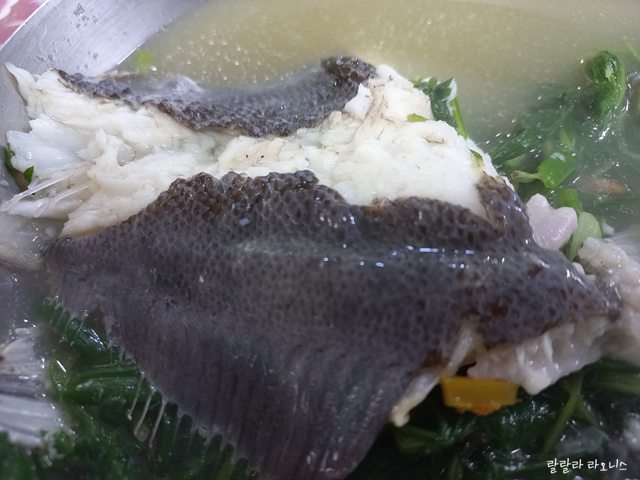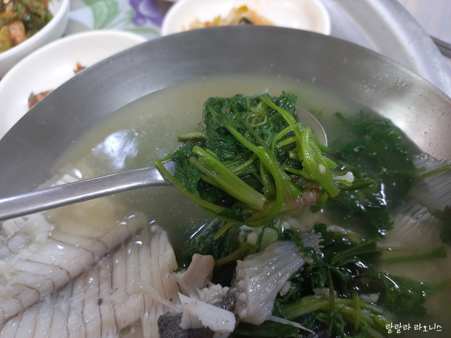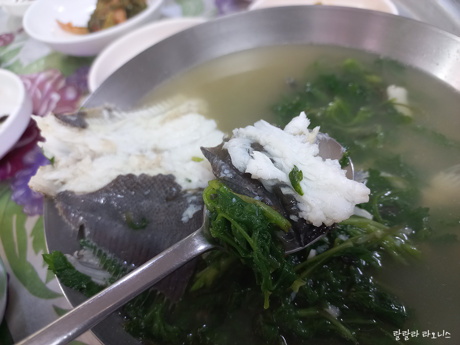 터미널회식당의 이 생선의 이름도 정확히는 모르겠습니다. 도다리겠구나라고 먹습니다. 도다리가 아니고 그냥 가자미여도 상관없습니다. 도다리쑥국에 어떤 생선이 들어가는 것은 중요하지 않습니다. 왜냐면 쑥에서 나오는 향과 맛이 진짜니까요.