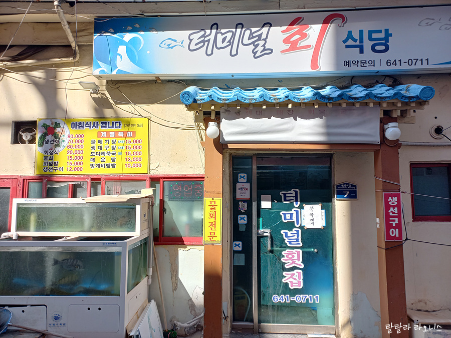 터미널회식당입니다. 서호시장에서 살짝 벗어나 작은 길 안에 있는 식당입니다. 통영여객선터미널이 가까워서 터미널이란 상호를 사용하는 것 같습니다. 저만의 생각입니다. 식당 외부는 솔직히 허름합니다. 맛있는 집일까? 라는 의구심도 있습니다. 문 앞에 블루리본 붙어 있는 것으로 봐서는 내공 있는 집이겠거니 기대합니다.
