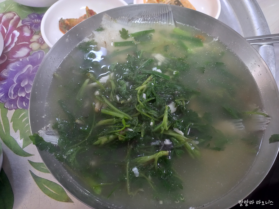 오늘의 주인공 도다리쑥국입니다. 쑥은 통영 앞 한산도에서 온 것입니다. 제가 밥 먹고 있는데 사장님 가족분들이 오셔서 식사하시더라고요. 그때 한산도에서 캔 쑥이라는 말을 들었습니다. 수북하게 올려진 쑥 아래로 생선 덩어리가 보입니다.