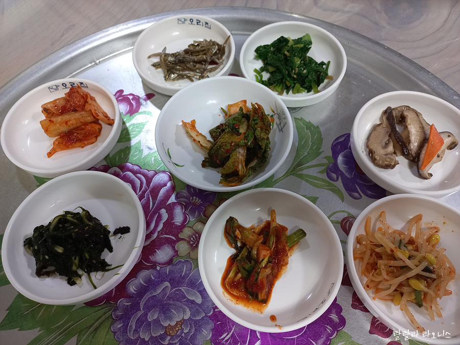 꽃무늬 쟁반을 통해 반찬이 나옵니다. 쟁반에서 따로 그릇 내리지 않고 먹습니다. 굳이 내릴 필요 없습니다. 김치, 멸치, 콩나물 등 여느 백반집에서 볼 수 있는 흔한 반찬입니다. 이 중에서 시금치가 맛나더군요. 맛있게 무쳐내신 것도 있겠지만 시금치 자체가 달달하니 입맛을 당깁니다.