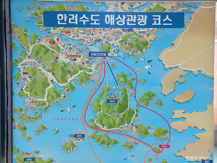 지도가 거꾸로 되어서 캡처되었습니다. 유람선은 한산도 옆을 열심히 달리고 있습니다. 1592년 이순신 장군이 한산도 앞바다에서 왜군을 섬멸하던 모습을 상상합니다.
