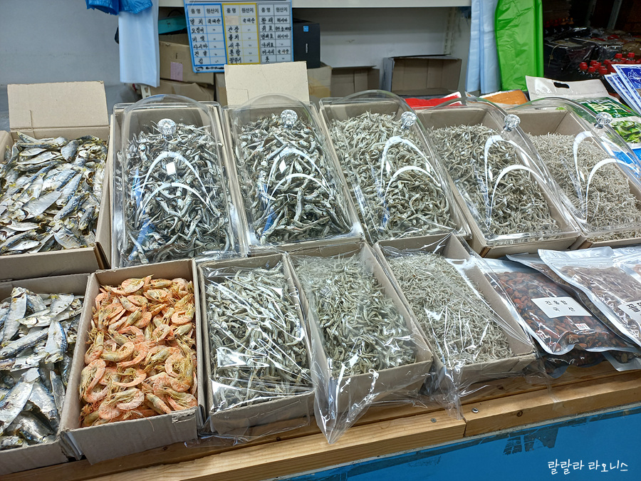 승선권 확인하고 배 타기 위해 1층으로 내려옵니다. 1층에는 여러 건어물 가게가 모여 있습니다. 남해안이기에 멸치가 많이 보입니다. 멸치가 작다고 무시하면 안 됩니다. 얘네들 모이면 값이 많이 오릅니다.