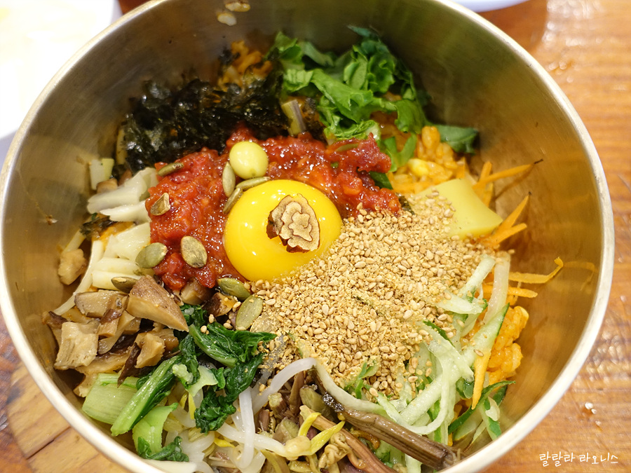 성미당은 전통비빔밥과 육회비빔밥 2종류가 있습니다. 이왕 먹는 거 잘 먹자고 육회비빔밥으로 주문합니다. 비주얼만 봐도 비빔밥 만드는 데 정성을 들였다는 것이 보입니다. 밥 위에 여러 가지 채소가 올려져 있습니다. 당연히 육회도 보이고요. 참깨도 솔솔 뿌려져 있습니다. 가운데 노른자 그 위에 대추 장식까지. 입으로 먹기 전에 눈으로 아름다움을 먹습니다.