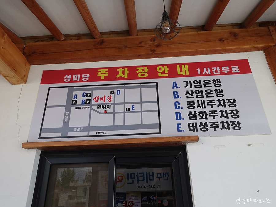 성미당 바로 앞에 주차할 수 있습니다. 식당 앞은 주차 공간이 좁아서 빈자리가 보이지 않습니다. 식당 근처 여러 주차장에 주차할 수 있습니다. 1시간 무료. 식당 입구에는 전북 천년 명가, 백년가게, 전주 음식 명소 등으로 선정되었다는 현수막이 걸려 있습니다.