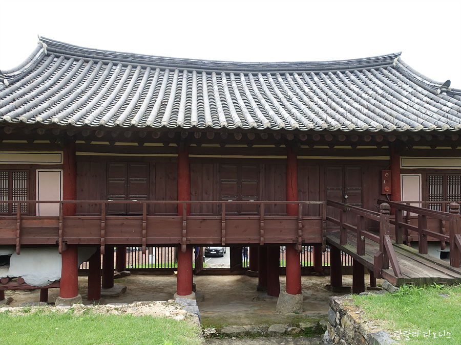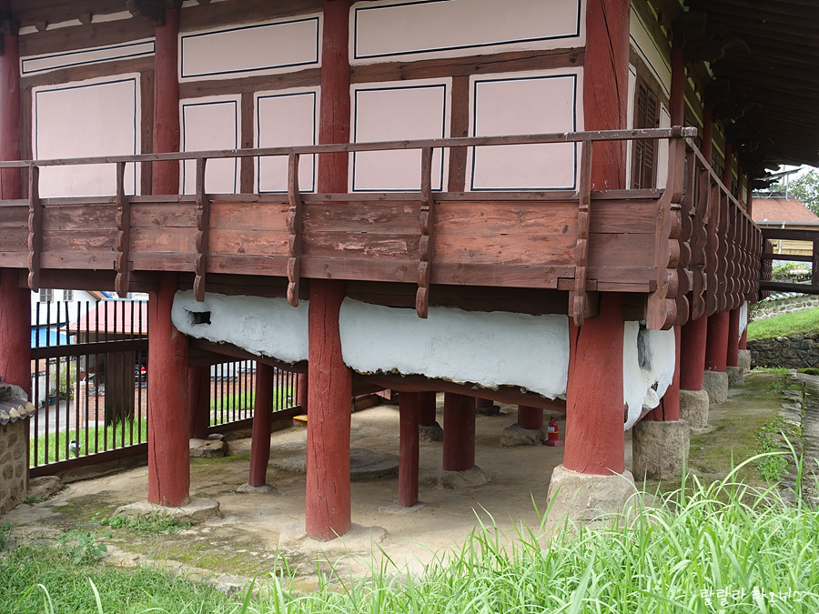 명륜당 바닥에 회색 구조물에 눈길이 갑니다. 명륜당 양 끝에 있는 회색 구조물은 온돌입니다. 쌩 나무 바닥은 겨울에는 추울 것이고요. 보길도 윤선도가 지은 세연정에서 온돌을 봤습니다. 윤선도는 겨울에도 놀려고 온돌을 깔았습니다. 옥천향교는 겨울에도 공부 열심히 하라고 온돌을 깔았을 것 같습니다.