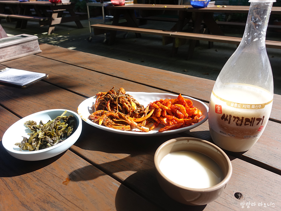 개인적인 바람은 성인봉도 오르고 나리분지도 걸으며 울릉도 사람들 모습을 보는 것입니다. 패키지는 개인 취향을 다 맞춰 줄 수는 없습니다. 우리는 자연스럽게 어느 식당 앞에 내립니다. 울릉도 특산품인 부지깽이, 삼나물(눈개승마), 더덕 등과 함께 씨껍데기 막걸리 마십니다. 막걸리 맛있습니다. 셉니다. 울릉도 여행길에 꼭 먹어봐야 할 술과 나물입니다.