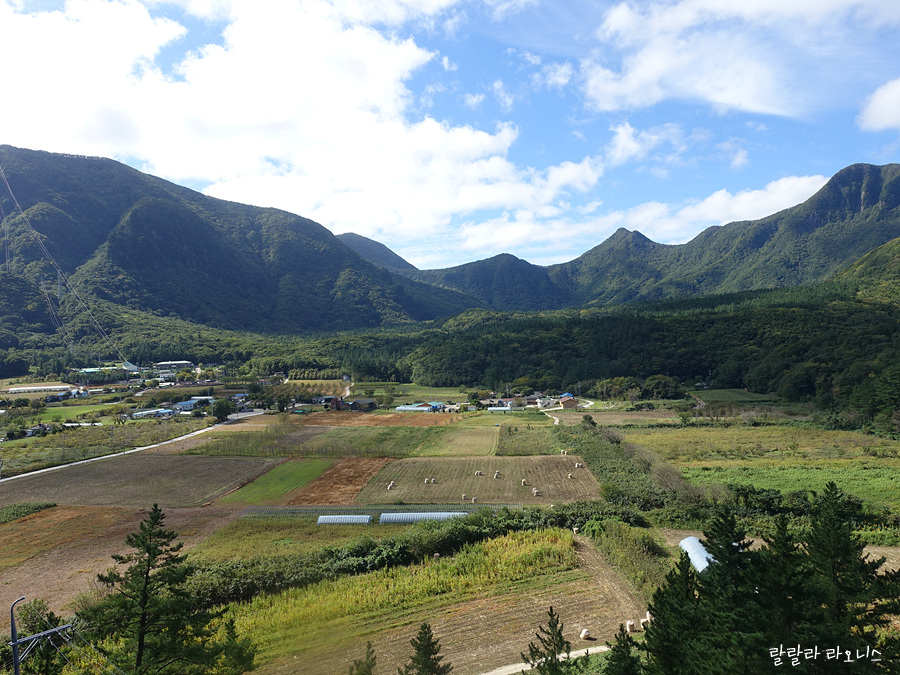 나리분지 입구에 전망대가 있습니다. 나리분지를 한눈에 조망할 수 있습니다. 울릉도의 유일한 평지입니다. 칼데라입니다. 다시 말하면 함몰된 것이죠. 옛날에 먹을 것이 없어 섬말나리의 뿌리를 캐 먹어서 나리분지라는 이름을 갖게 되었습니다. 나리라는 단어가 예쁜데 사연은 슬픕니다. 가을 수확이 끝난 나리분지가 평화롭습니다. 나리분지는 화산회토여서 보수력이 약합니다. 논농사는 못 하고 밭농사만 합니다.