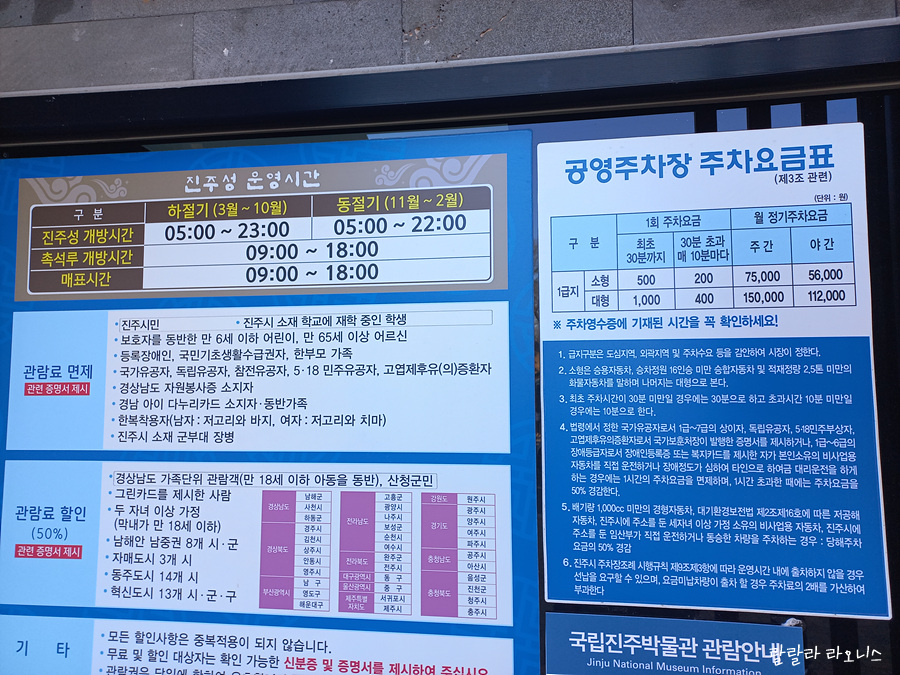 진주성은 오전 5시부터 개방합니다. 밤에도 입장할 수 있습니다. 촉석루는 오전 9시부터 오후 6시까지고요. 주차 요금은 30분까지 500원이고 시간 경과에 따라 추가 요금이 있습니다. 관람료는 어른 2,000원입니다. 관람료 면제 및 할인 대상이 많습니다. 잘 확인해서 요금 혜택 받아보시고요.