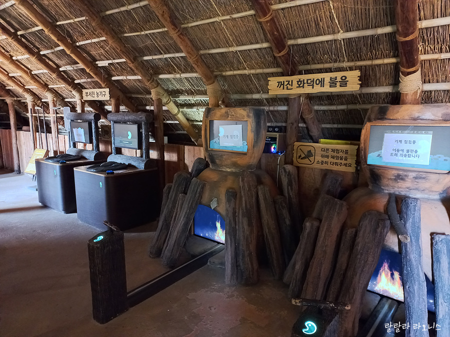 집 안에 들어왔습니다. 청동기시대 사람들 삶을 가까이서 볼 수 있습니다. 여러 체험 시설이 있는데 몇몇 기기는 점검 중이어서 할 수 없습니다. 집 들어가는 문이 작습니다. 구경하고 나가다 머리를 세게 부딪혔습니다. 집 무너졌을까봐 돌아봅니다. 난 돌머리.