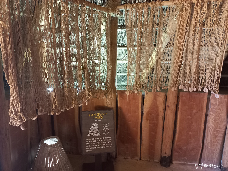 대평마을에서 어망추 유적을 발견했고 그물을 복원했습니다. 그물에 어망추까지 달아 놓으니 오늘날의 그물과 크게 다르지 않습니다. 그물이 신기해서 오랫동안 보았습니다. 옷을 만들 수 있다면 그물도 충분히 만들 수 있었을 것입니다. 마을 앞으로 남강이 흘렀으니 물고기도 많이 잡았겠고요.