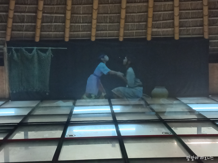 대평이네 집이라 이름 붙여진 대형 장방형 집자리로 들어왔습니다. 가상현실처럼 영상이 튀어나옵니다. 청동기시대 사람들 모습을 보여줍니다. 한 편의 영화처럼 배우(?)들이 연기하고 스토리가 있습니다. 유리 아래에는 발굴 중인 집자리를 그대로 보여줍니다.