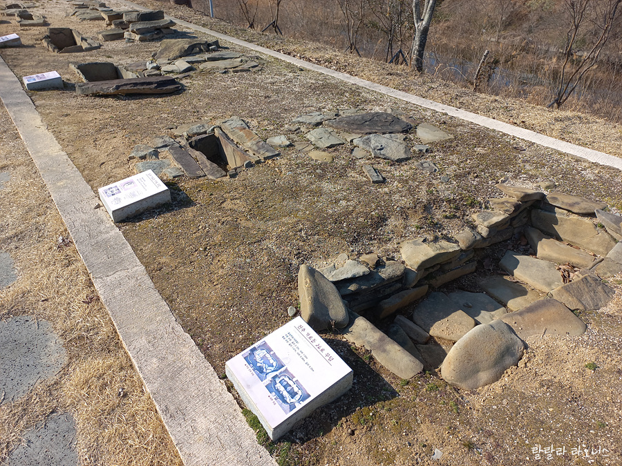 진주 가호동 무덤이라 적힌 무덤들이 쭉 이어집니다. 돌널무덤(石棺墓, 석관묘)입니다. 평평한 돌(판석)을 상자 모형으로 만들어 관처럼 사용합니다. 고인돌보다 앞선 시대에 나온 무덤입니다. 청동기시대 한반도 전역에서 볼 수 있는 무덤 형태입니다.