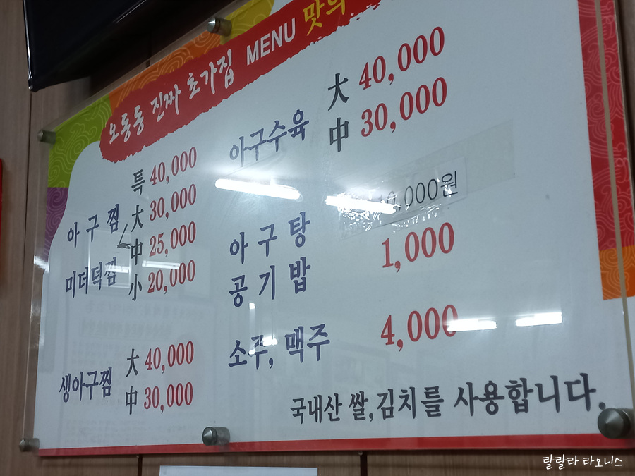 메뉴판에는 아구와 미더덕만 있습니다. 미더덕찜도 있다지만 아구만 판매한다고 해도 과언은 아닙니다. 찜, 수육, 탕 중에서 선택하면 됩니다. 여기서 주목할 것은 생아구찜과 그냥 아구찜입니다. 생아구찜이 있다면 그냥 아구찜은 뭐지? 하는 궁금증이 생깁니다. 그 차이는 아래서 확인해 드리겠습니다. 저는 차이를 알고 왔지만요. 저는 아구찜 소 주문합니다.
